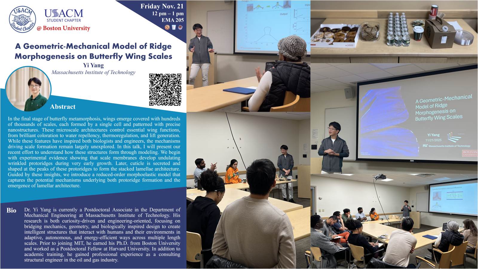 The USACM Student Chapter at Boston University is hosting its Fall 2025 Seminar series. The first session took place on November 21 in 730 Commonwealth Ave, featuring Yi Yang from Massachusetts Institute of Technology presenting on